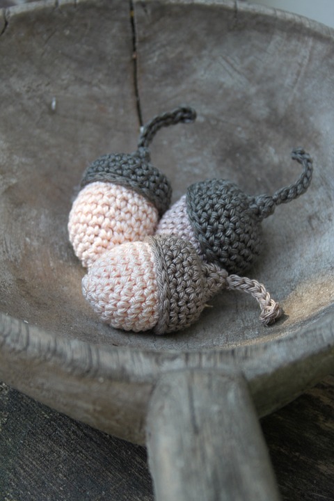 9. Herbal pillow: If you can sow, you can sow a small pillow with dried lavender or chamomile in it to help with sleeping. If you can knit or crochet, you can make all sorts of fun designs like the little acorns below. If all else fails, put the same herbs in a small drawstring pouch or large cloth tea bag that can be added to the inside of a pillow case.