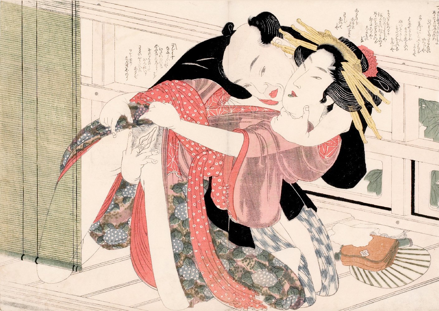 Picture at the top of the article: A Geisha and Her Client in the Osaka Pleasure Quarters (Osaka iromachi no geisha to kyaku) from the series The Safflower Princess (Suetsumuhana) by Katsushika Hokusū