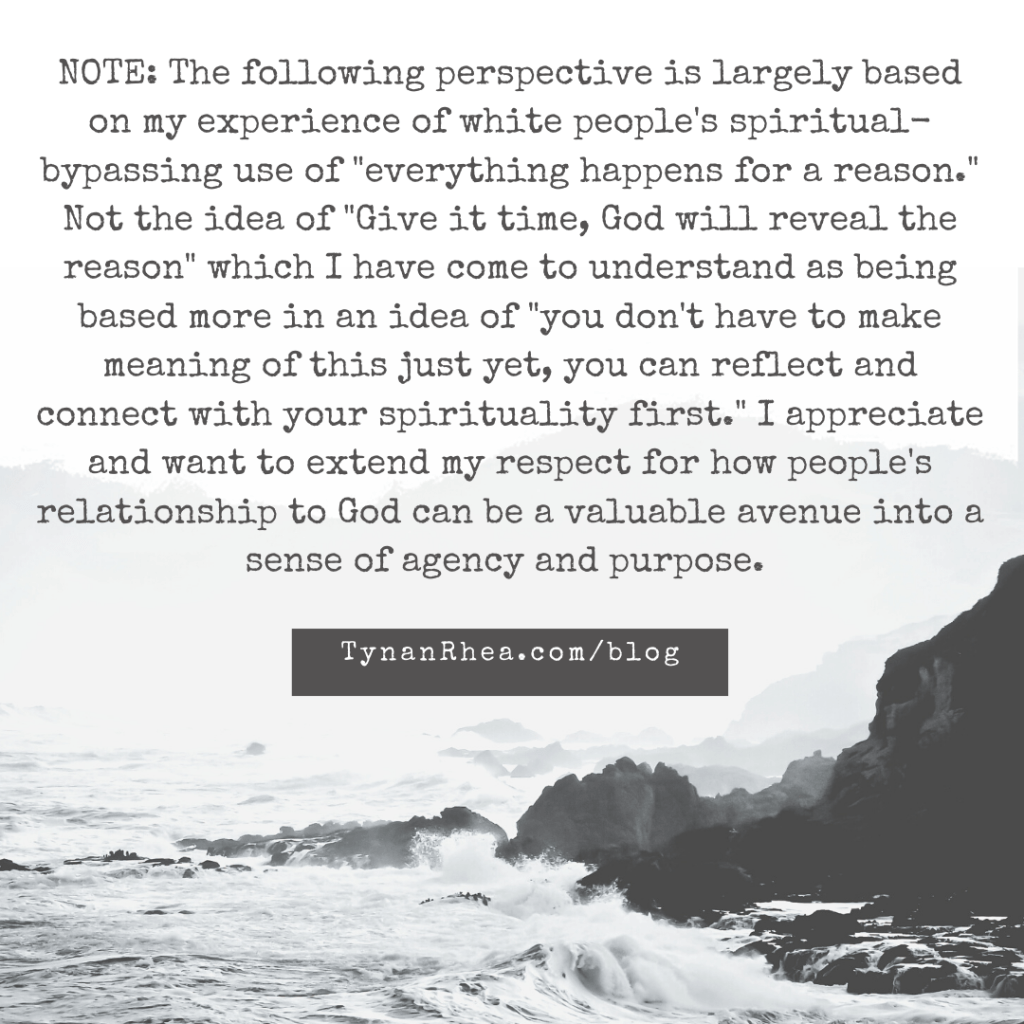NOTE: The following perspective is largely based on my experience of white people’s spiritual-bypassing use of “everything happens for a reason.” Not the idea of “Give it time, God will reveal the reason” which I have come to understand as being based more in an idea of “you don’t have to make meaning of this just yet, you can reflect and connect with your spirituality first.” I appreciate and want to extend my respect for how people’s relationship to God can be a valuable avenue into a sense of agency and purpose.